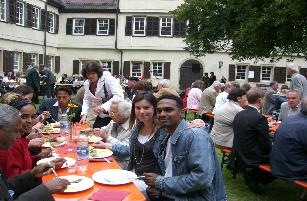 Das Wetter bessert sich und nach dem Essen bietet der Innenhof des Stifts ein bunt bewegtes Bild von kleinen Grüppchen, die sich unterhalten. Viele sind jetzt noch dazu gekommen.